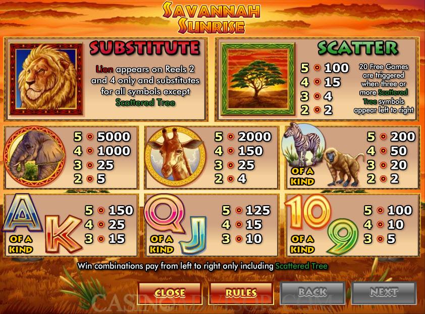 Given below are the payouts for various rewarding symbols in Savannah Sunrise. The payouts are mentioned in coins.