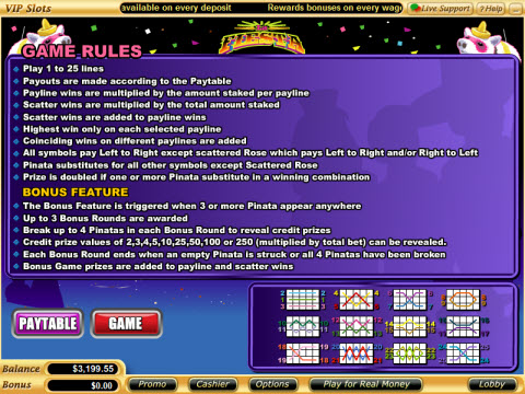 La Fiesta is a 5 reel and 25 payline slot game. The coin denominations vary from $0.01 to $10.00 making it suitable for both low rollers and high rollers. The game does not offer a progressive jackpot but has a high fixed jackpot of 10,000 coins. This is hit when five piñata symbols line-up in an enabled payline. At maximum line bet the payout is $100,000. The rose symbol offers scatter payouts. The maximum payout of 250 coins occurs when five rose symbols are found anywhere on the reels. At maximum total bet the payout for this is $62,500. La Fiesta Online Casino Video Slot Game Payout Table Preview: