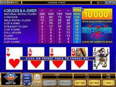 The highest jackpot available is up to 10,000 coins (based on the maximum amount of coins wagered), which is achieved when you wind up with four deuces and a joker - in other words, when you are dealt all five of the wild cards. The Royal Flush pays up to 4000 coins.