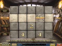 The scatter symbol is the Coliseum symbol which can appear scattered anywhere on the reels. When there are two or more scatter symbols on the reels, the player is paid an amount which ranges from 2x to 100x the triggering line bet. When there are three or more scatter symbols, the Coliseum bonus round is activated. In the Coliseum Bonus Round, the player is shown an array of stones that are arranged in a 4x5 matrix. He/she must select one stone from each row. The first row represents the number of free spins, the second row represents the multiplier, the third has the extra scatter symbol that can be used in the free spins and the fourth row have an extra wild symbol for the free spins.