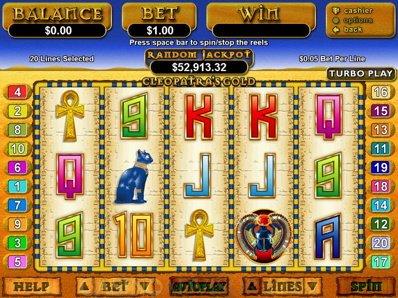 Cleopatra’s Gold has a progressive jackpot that is hit randomly. This does not depend on the amount wagered or on the combinations that appear in the enabled paylines. The second highest fixed jackpot is 1000 coins when five Scarab symbols or five Cat symbols appear in an enabled payline. The payout table can be accessed by clicking the HELP button.