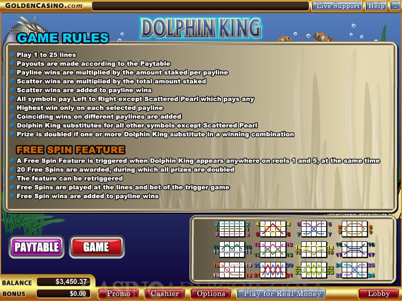 The payouts in coins for each of the symbols appearing in all five reels an enabled payline are given below. Except for the Dolphin King all line payouts are double of the shown values if made using the Dolphin King wild symbol.